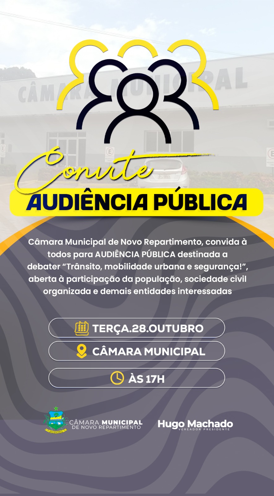 Novo Repartimento, PA – A Câmara Municipal de Novo Repartimento anuncia uma importante Audiência Pública, agendada para o dia 28 de outubro de 2025, às 17h, no Plenário da Casa Legislativa. O encontro, convocado por meio do Edital no 01/2025, terá como foco central e de vital importância para a população, o tema “Trânsito, mobilidade urbana e segurança!”.